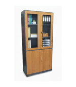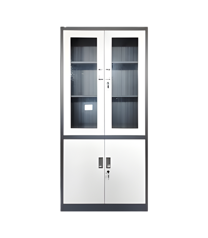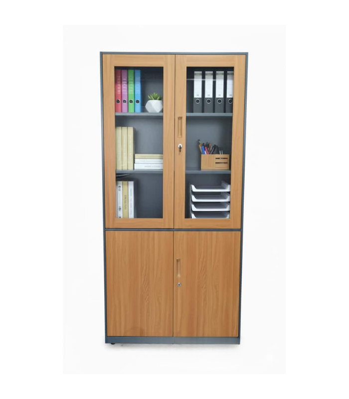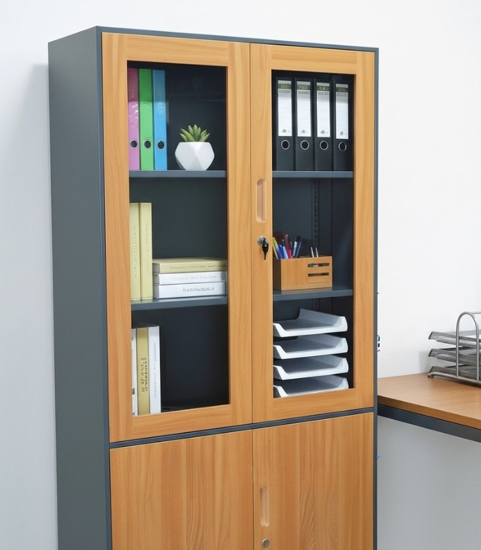 Le compartiment supérieur, doté de portes vitrées, met en valeur vos classeurs, documents ou objets décoratifs tout en les protégeant de la poussière. En partie basse, les portes pleines avec serrure offrent un espace sécurisé pour le rangement de vos dossiers confidentiels et fournitures.