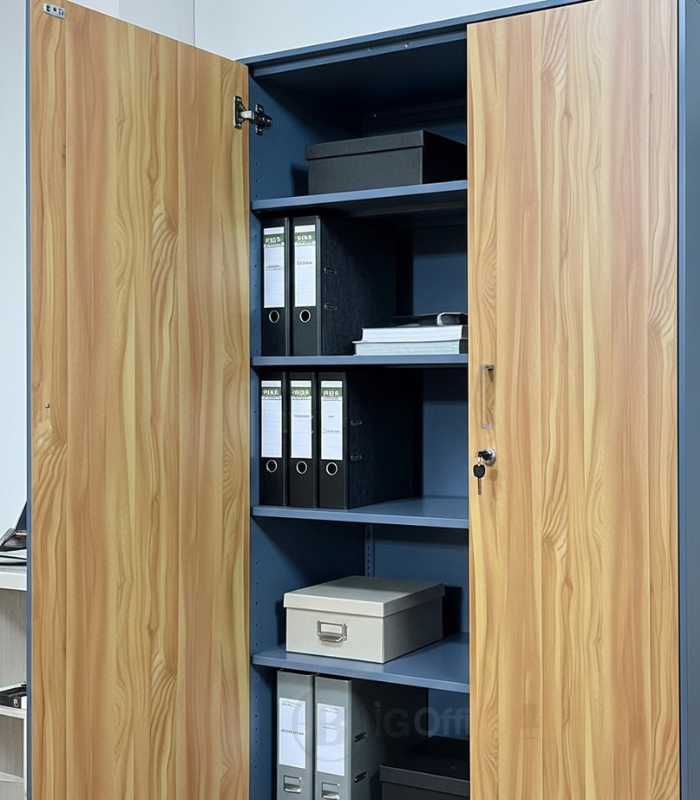 Une armoire bibliothèque métallique conçue pour répondre aux exigences des environnements professionnels. Sa structure en métal robuste associée à des portes finition bois clair lui confère une solidité remarquable et une esthétique moderne. Elle s’intègre aisément dans les bureaux de direction, open spaces, salles d’archives ou espaces d’accueil.