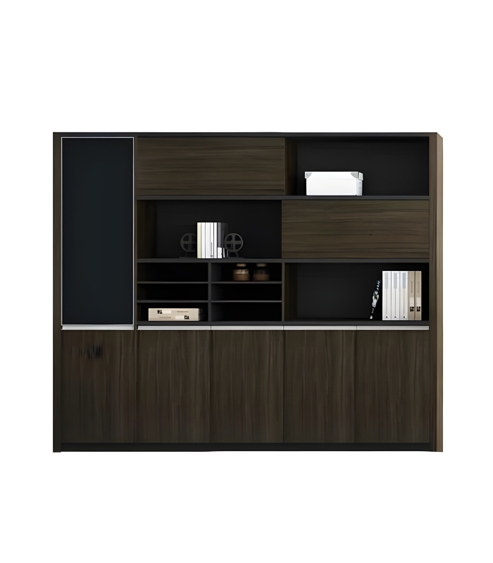 Cette bibliothèque contemporaine allie élégance graphique et modularité. Sa structure en grille symétrique intègre des étagères ouvertes et des panneaux contrastés bois/noir, créant un jeu visuel dynamique. Le centre est accentué par quatre portes verticales – deux en bois naturel, deux en verre fumé encadré de noir – offrant à la fois rangement discret et vitrine raffinée.