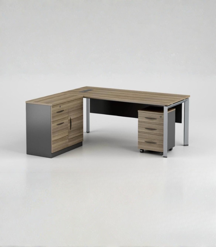 - À droite : un caisson mobile à trois tiroirs sur roulettes