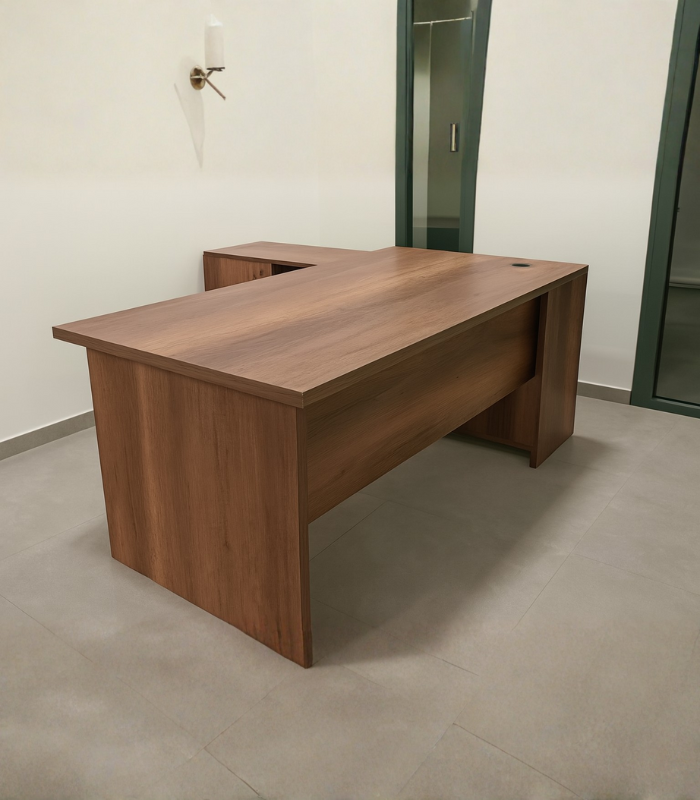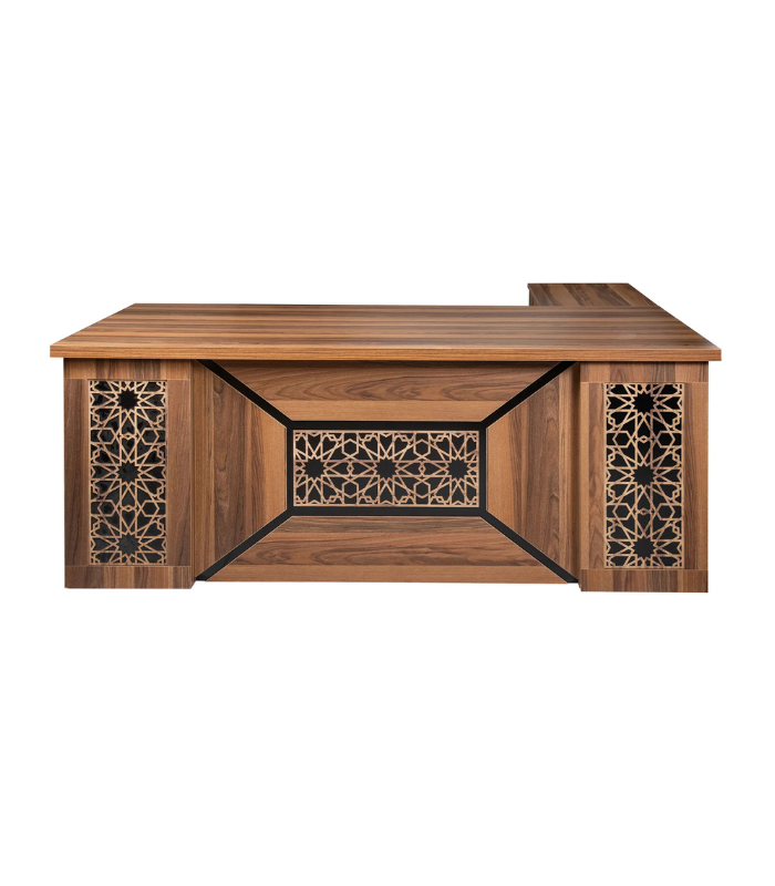 Le bureau PrestigeWood incarne l’élégance et la prestance. Sa structure en bois massif ou mélaminé haut de gamme est sublimée par des panneaux décoratifs à motifs géométriques inspirés de l’art traditionnel, encadrés par des bordures contrastées. Le large plateau offre un espace de travail confortable, tandis que les finitions soignées renforcent son caractère prestigieux.