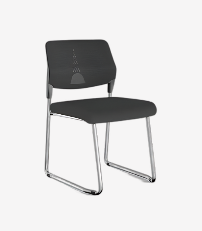 Ce modèle se distingue par son dossier ajouré à fentes horizontales, favorisant la ventilation tout en apportant une touche graphique à l’espace. L’assise rembourrée assure un confort discret mais efficace, et les accoudoirs intégrés à la structure offrent un soutien latéral harmonieux. La base en forme de luge, réalisée en métal brillant, confère une légère flexibilité à l’assise tout en garantissant une excellente stabilité.