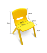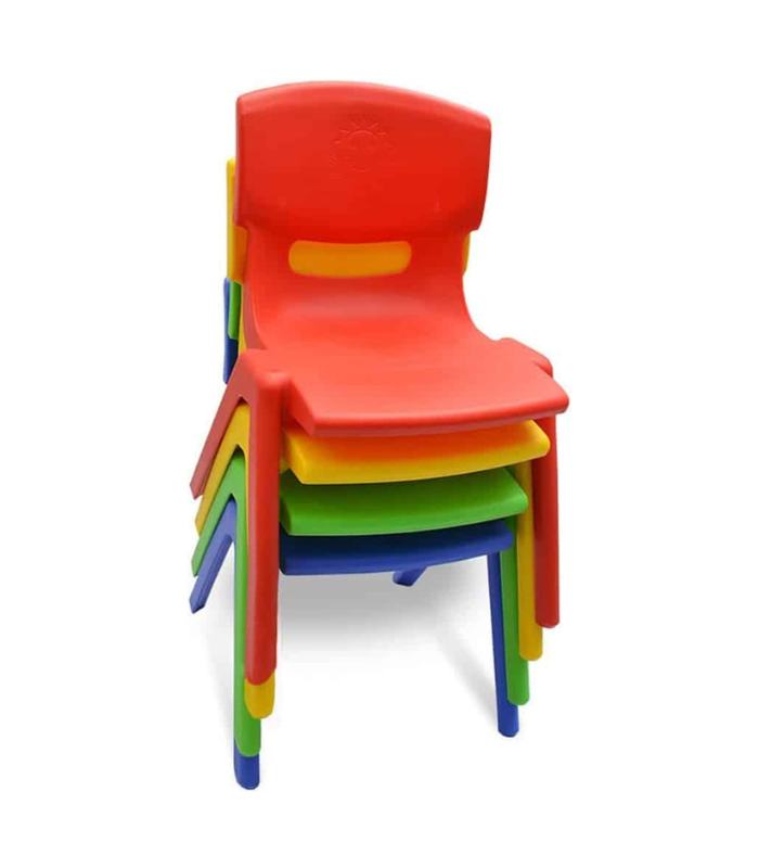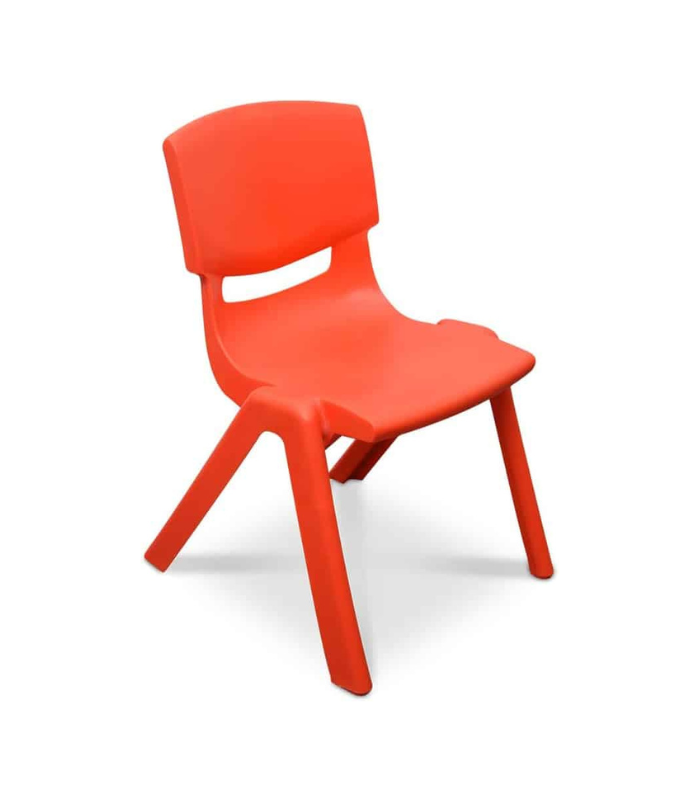 Chaise en plastique pour enfants, disponible en rouge, jaune, vert et bleu. Légère, stable et facile à nettoyer, idéale pour les écoles maternelles, crèches ou espaces d’activités.