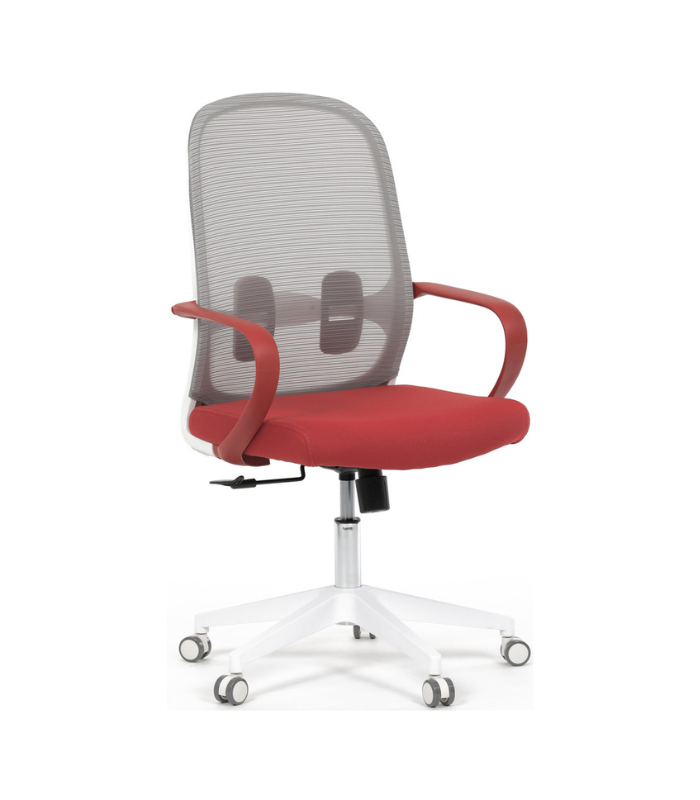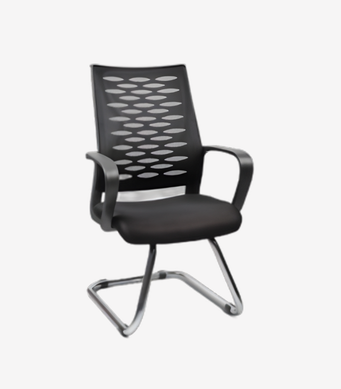 Ce modèle se distingue par son dossier structuré avec des ouvertures ovales horizontales, offrant à la fois ventilation et esthétique graphique. L’assise est conçue pour un confort discret mais efficace, et les accoudoirs intégrés à la structure assurent un soutien latéral fluide. La base en forme de luge, réalisée en métal brillant, confère une légère flexibilité à l’assise tout en garantissant une excellente stabilité.