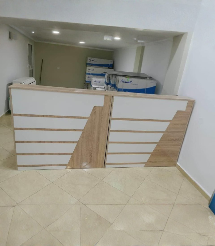 Ce panneau décoratif se distingue par son design graphique et sa finition bois naturel. Trois bandes horizontales blanches traversent la façade, créant un effet visuel dynamique et structuré. Des éléments diagonaux viennent compléter la composition, renforçant l’aspect contemporain. Le panneau est présenté dans une pièce carrelée, avec en arrière-plan plusieurs cartons techniques “Airwell”, suggérant un espace de stockage ou d’installation. L’ambiance est claire, fonctionnelle et bien éclairée, adaptée aux environnements professionnels ou techniques.