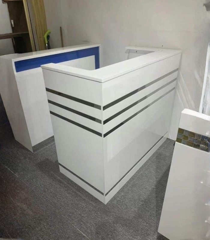 Ce comptoir se distingue par son design épuré et ses finitions contrastées. La structure principale est blanche, rehaussée par des bandes horizontales métalliques qui soulignent les lignes du meuble. Sa forme en U permet une réception fluide et ergonomique. À l’arrière, un second module blanc avec panneau intérieur bleu offre un espace de rangement ou de travail complémentaire. Le sol est recouvert de moquette grise, et l’environnement mural reste neutre, avec un panneau décoratif en mosaïque visible sur le côté droit. L’ensemble crée une ambiance professionnelle, fraîche et contemporaine.