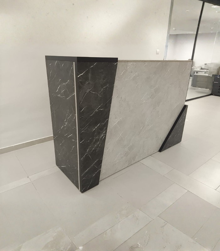 Ce comptoir d’accueil rectangulaire est conçu pour les entreprises, cabinets ou établissements recevant du public souhaitant une première impression forte et raffinée. Les panneaux latéraux en finition marbre noir veiné apportent du caractère et de la profondeur, tandis que l’insert central gris clair adoucit l’ensemble avec une texture subtile. La surface plane permet l’installation d’un ordinateur, d’un téléphone ou d’accessoires de réception. L’ensemble s’intègre parfaitement dans un environnement contemporain avec sol carrelé, mobilier vitré et éclairage indirect.