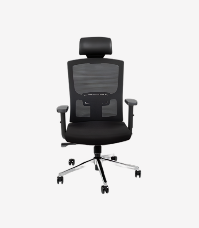 Ce fauteuil ergonomique se distingue par son dossier haut en maille aérée, favorisant une ventilation naturelle et un bon maintien du dos. L’appui-tête réglable soutient la nuque, tandis que l’assise généreusement rembourrée assure un confort prolongé. Les accoudoirs ajustables permettent une adaptation précise à la posture de chaque utilisateur. La base chromée à cinq branches, équipée de roulettes multidirectionnelles, garantit une mobilité fluide et une excellente stabilité.