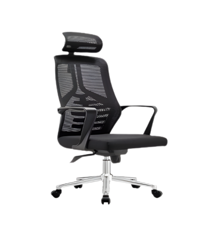 Adoptez un fauteuil de bureau au confort respirant et au style contemporain : dossier en maille, appui-tête intégré, assise rembourrée et base chromée à roulettes. Idéal pour les longues journées de travail, à la maison ou en entreprise.