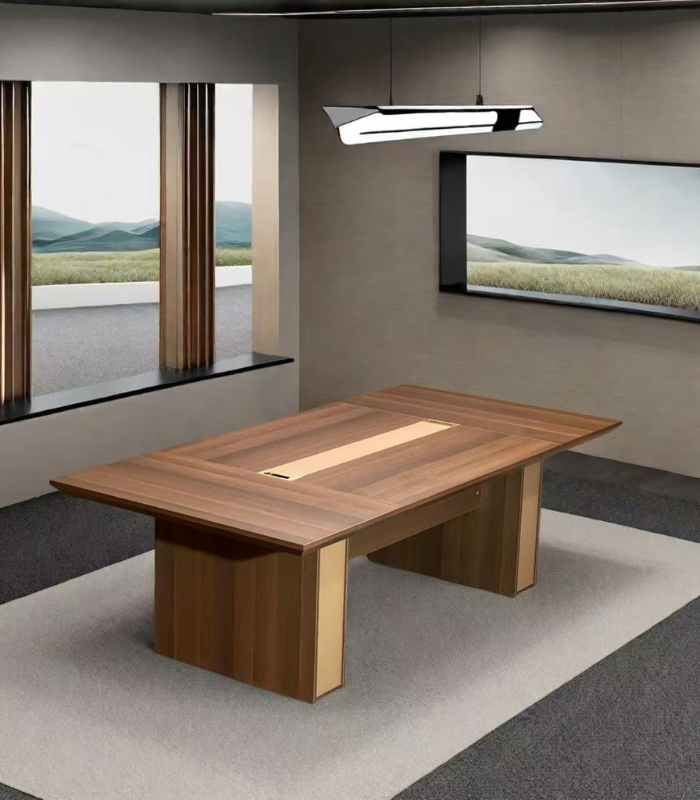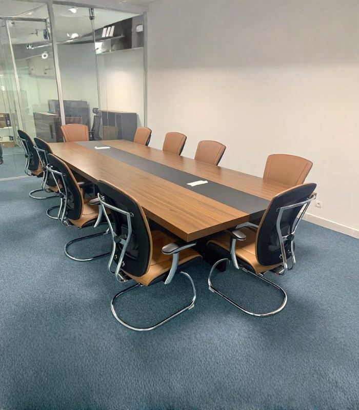 Cette table de réunion séduit par son design épuré et ses finitions naturelles. Son plateau rectangulaire en bois est rehaussé d’un insert central clair, créant un contraste subtil et raffiné. Elle offre une surface généreuse pour accueillir vos réunions d’équipe ou vos échanges stratégiques.