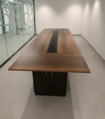 Table de conférence en bois avec bande centrale noire et passe-câbles intégrés. Idéale pour les salles de réunion modernes, combinant design épuré et fonctionnalités techniques.