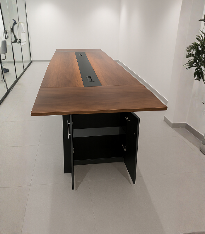 Le piètement noir intègre un meuble de rangement discret, accessible par des portes battantes, idéal pour stocker les accessoires techniques ou les documents de réunion. Ce modèle s’intègre parfaitement dans les espaces lumineux et minimalistes, tout en apportant une touche chaleureuse grâce à sa finition bois.